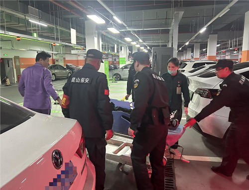2024年12月6日中午12點(diǎn)左右,保安公司駐中醫(yī)醫(yī)院保安員朱劍剛在地下停車場(chǎng)進(jìn)行日常巡邏,在巡邏至250號(hào)車位時(shí),朱劍剛發(fā)現(xiàn)一名病人暈倒在汽車?yán)锴闆r危急,立即使用對(duì)講機(jī)呼叫急診部門,請(qǐng)求派遣拖床和護(hù)士前來處置。急診部門迅速響應(yīng),派遣急診保安推著拖床前往現(xiàn)場(chǎng),同時(shí),附近的四名巡邏隊(duì)員迅速趕到250號(hào)車位一起協(xié)助急診隊(duì)員進(jìn)行救援。