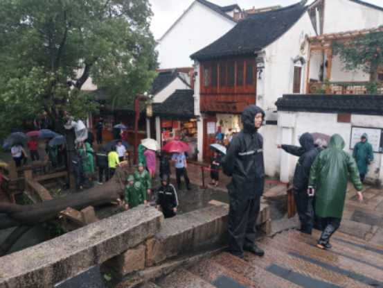 柏蘆地下停車場提前制定抗臺防汛應(yīng)急預(yù)案設(shè)立應(yīng)急小組,地下車庫安排2位隊(duì)員進(jìn)行24小時(shí)值班,根據(jù)技術(shù)要求,確認(rèn)防汛消防抗臺物資是否齊全,并對搶險(xiǎn)設(shè)施設(shè)備進(jìn)行檢查,排除故障隱患。亭林公園駐點(diǎn)保安保潔全力抗擊臺風(fēng),全力配合園內(nèi)各項(xiàng)防汛抗臺工作,隊(duì)員對疏通堵塞的窨井蓋和倒塌掉落的樹枝進(jìn)行清理。城管協(xié)管員、交通指揮員對路面積水嚴(yán)重路段窨井蓋進(jìn)行疏通;周莊景區(qū)隊(duì)員立即疏散游客離開危險(xiǎn)區(qū)域,并冒雨幫助沿河店鋪固定窗戶。