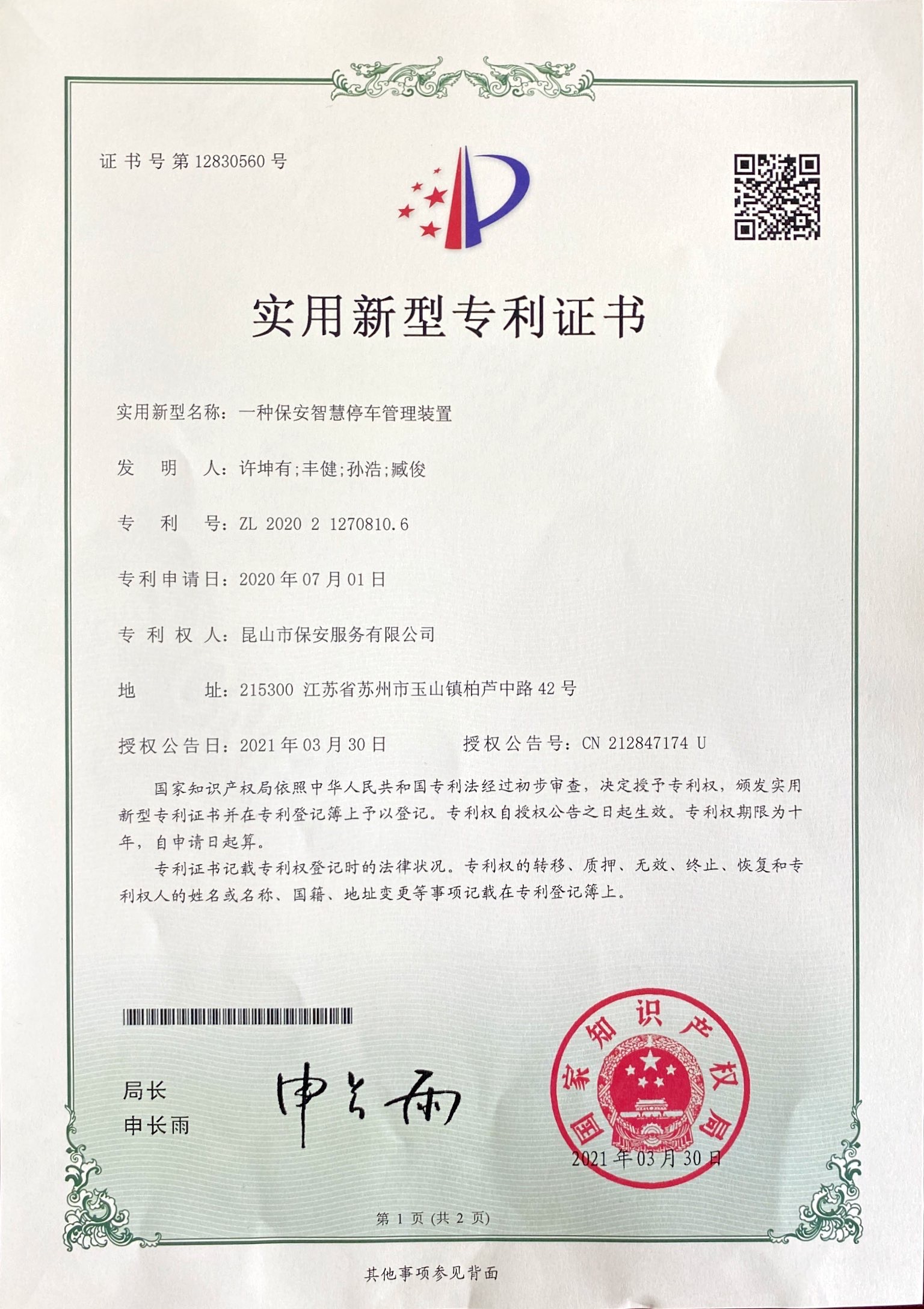 近日,保安公司申請的一種保安智慧停車管理裝置通過國家知識產(chǎn)權(quán)局審核,獲得國家實(shí)用新型專利證書。