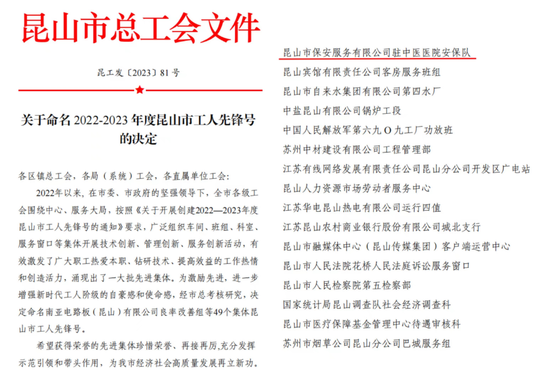 安保公司駐中醫(yī)醫(yī)院安保隊榮獲“2022-2023年度昆山市工人先鋒號”稱號