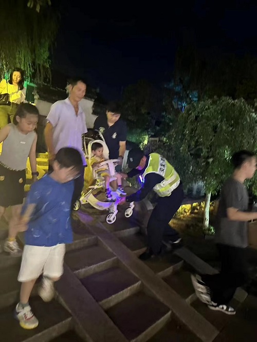 10月7日晚上19點左右,在周莊古鎮(zhèn)內(nèi)一名游客獨自帶著小朋友從周莊古鎮(zhèn)景區(qū)出來,在下青龍橋的時候,由于兒童推車有點不好推下去,為保護兒童安全,游客走的小心翼翼,安保公司下屬保安員發(fā)現(xiàn)后立即上前幫忙一起把兒童推車抬到平地上。