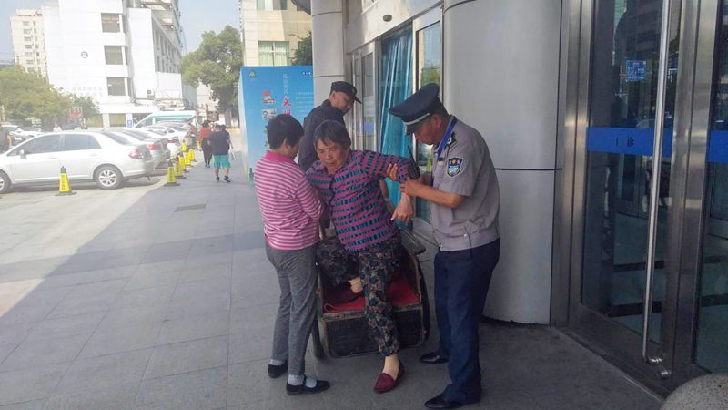 當(dāng)日盛玉林和張紅林負(fù)責(zé)中醫(yī)院門診大廳秩序維護(hù)工作,突然發(fā)現(xiàn)一位中年婦女騎著三輪車,車上躺坐著一名婦女,神色痛苦,盛玉林上前詢問得知因?yàn)榛颊咄饶_不便的緣故,所以把三輪車推到中醫(yī)院大廳門口,于是盛玉林與張紅林主動上前攙扶腿腳不便患者下車并送進(jìn)診室就診,患者對兩人熱心助人行為表示十分感謝。