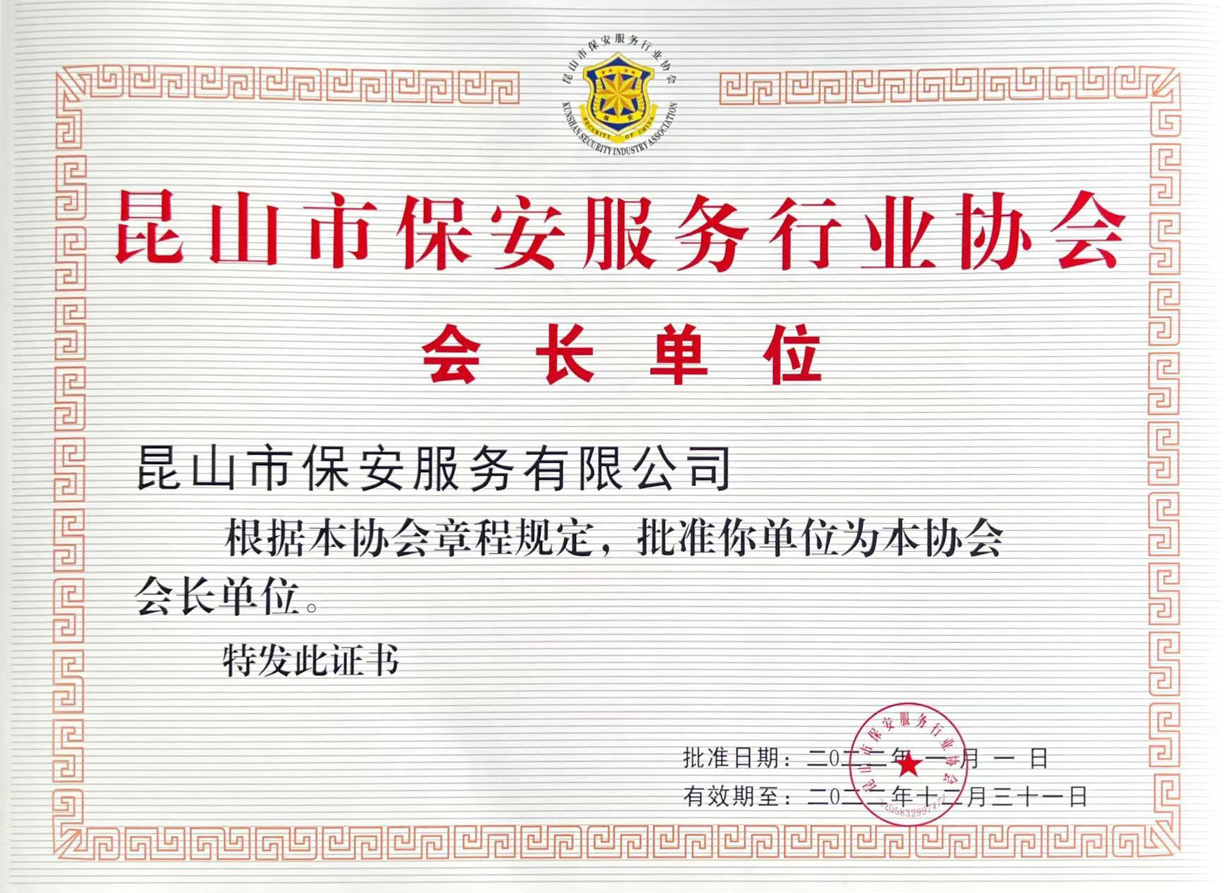 近日,保安公司當(dāng)選2022年度昆山市保安服務(wù)行業(yè)協(xié)會會長單位,這是公司連續(xù)第10年擔(dān)任昆山市保安服務(wù)行業(yè)協(xié)會會長單位。
