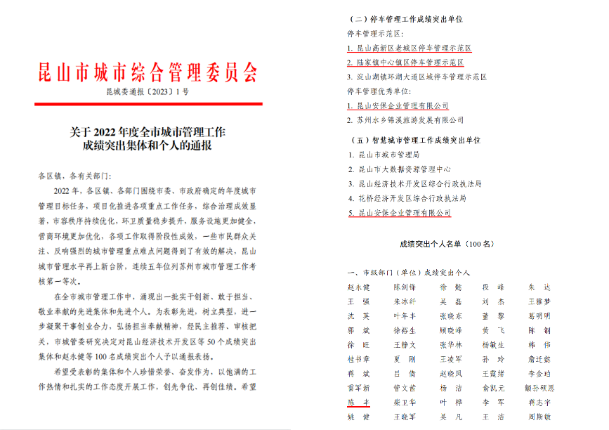 近日,在昆山市城市綜合管理委員會印發(fā)《關于2022 年度全市城市管理工作成績突出集體和個人的通報》中,昆山安保企業(yè)管理有限公司被評為“停車管理優(yōu)秀單位”、“智慧城市管理工作成績突出單位”。所管理的昆山高新區(qū)老城區(qū)停車管理示范區(qū)和陸家鎮(zhèn)中心鎮(zhèn)區(qū)停車管理示范區(qū)被評為“停車管理示范區(qū)”,安保公司總經(jīng)理助理陳豐被評為“成績突出個人”。